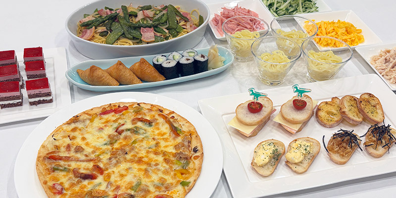 - バケットサンドバリエ(ハム&チーズ、揚げ玉&のり、たまごサラダ、ガーリックトースト)、ツナとピーマンのピザ、ベーコンとアスパラの和風スパゲティ、冷やし中華、助六寿司、黒部名水ポークカレー、皮付きポテトフライ、マッシュルームのポタージュ、サラダバー